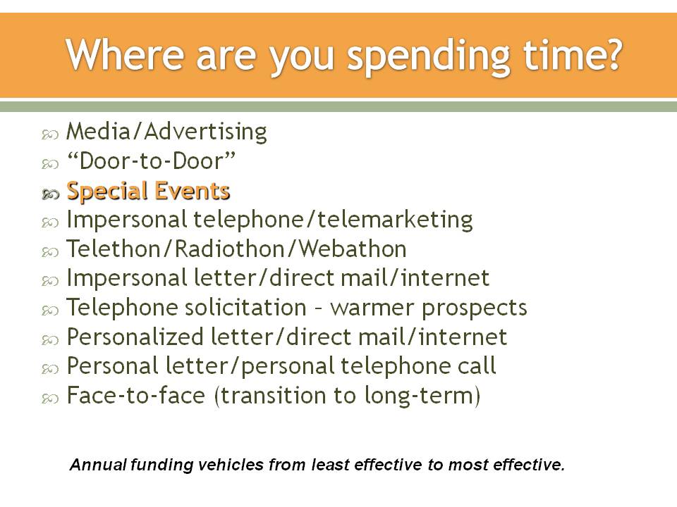 So, the first step for even small organizations is to concentrate on raising more annual funds in less time and with less effort. In other words, be more productive and build more solid relationships that will lead to more substantial gifts. Educate yourselves about people (in general and individually) and learn about all the different ways philanthropy can meet their needs.