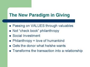 Advocate for open and free expression of generosity, read Gaudiani’s books, and join a Mastermind for Non-Profits group to operate more effectively within the New Paradigm of Philanthropy.